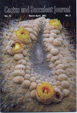 But, no - as our readers are aware - this organism is not aquatic but xerophytic: a cactus, or, to be more exact, Echinocactus platyacanthus, growing along the Charco Blanco-Guadalcazar road in San Luis Potosi. Apical meristems and developing flower buds need protection from the intense sun and annual marauders, so here the usually dense apical wool accomplishes this effeciently. But the apex of this specimen is linear rather than radial and thus appears to be cresting; or perhaps internal processes are causing lateral compression of the stem. If knowledgable readers can furnish explanations, their views will be summarized in our next issue.