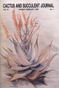 Aloe dhufarensis, a splendid aloe of subtle coloration, is discussed by Philip Favell in this issue. The painting is by Dorothy Byer, a talented artist of Vista, California, who used a plant in Mr. Favell's garden as a model. Dorothy, especially interested in aloes and terrestrial bromeliads, is preparing a series of paintings of these plants for our pages. |